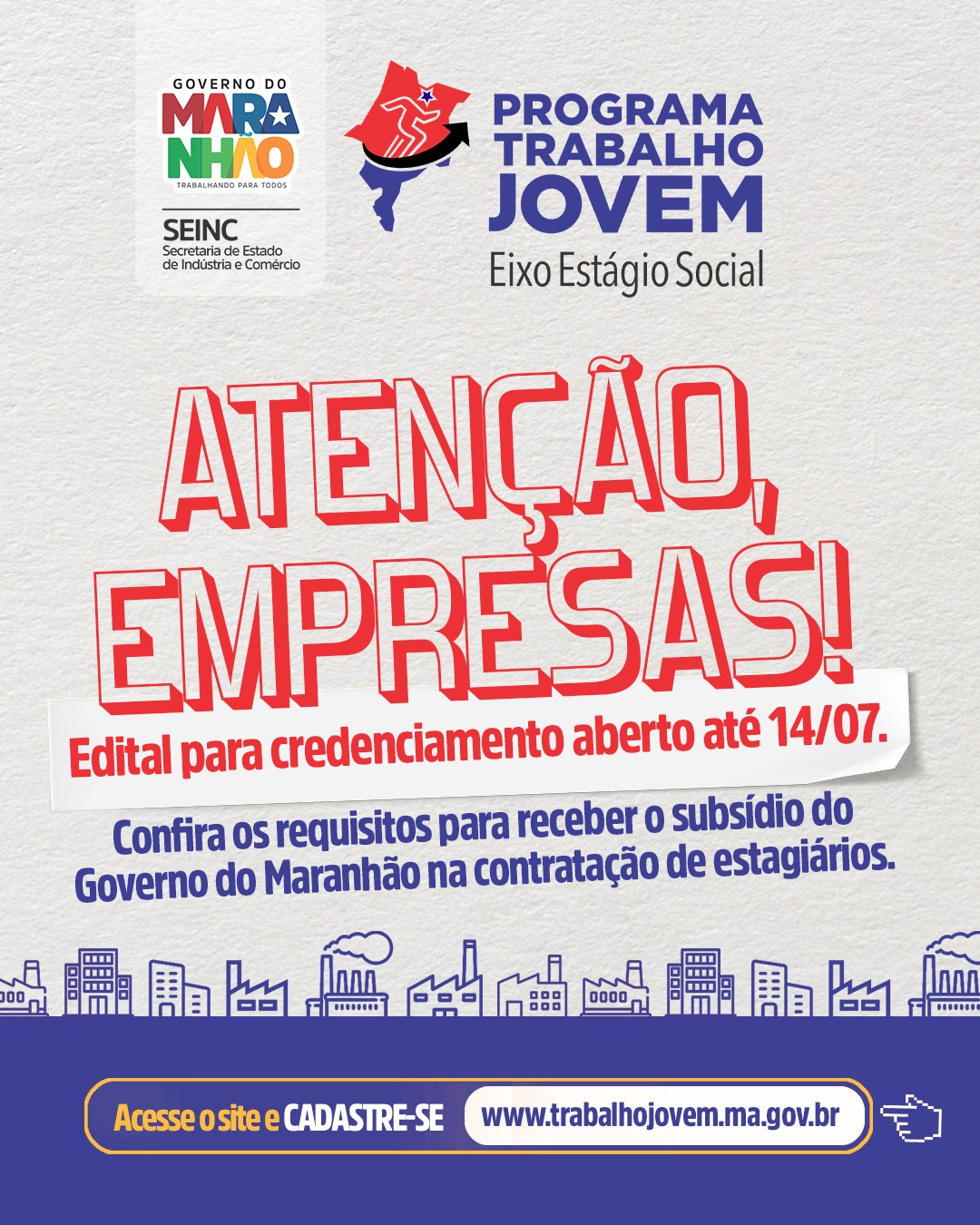 O Governo do Maranhão, por meio da Secretaria de Estado da Indústria e Comércio (Seinc), abriu edital nesta quarta-feira, 14, para que empresas interessadas em participar do Programa Trabalho Jovem, no Eixo Estágio Social, façam o credenciamento para receber os jovens inscritos no programa. A abertura do edital é mais uma etapa da execução do programa em 2023, que já cadastrou os órgãos públicos estaduais e capacitou os supervisores de estágio.