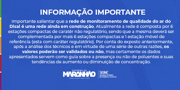 Diante desse cenário e em cumprimento a Política Nacional do Meio Ambiente (Lei n˚ 6.938, de 31 de agosto de 1981), da Resolução n˚5 do CONAMA de 15 de junho de 1989 que instituiu o Programa Nacional de Controle de Qualidade do Ar – PRONAR, e principalmente a Resolução n˚491 do CONAMA que estabelece os limites dos padrões de qualidade do ar e também define que é responsabilidade de cada Estado monitorar a qualidade do ar em seu próprio território e divulgar o Índice de Qualidade do Ar – IQAR, conforme definido em seu anexo, a SEINC-MA juntamente com a SEMA-MA determinou a criação da REDE DE MONITORAMENTO DE QUALIDADE DO AR DO DISAL (Distrito Industrial de São Luís) – RAMQAr DISAL.