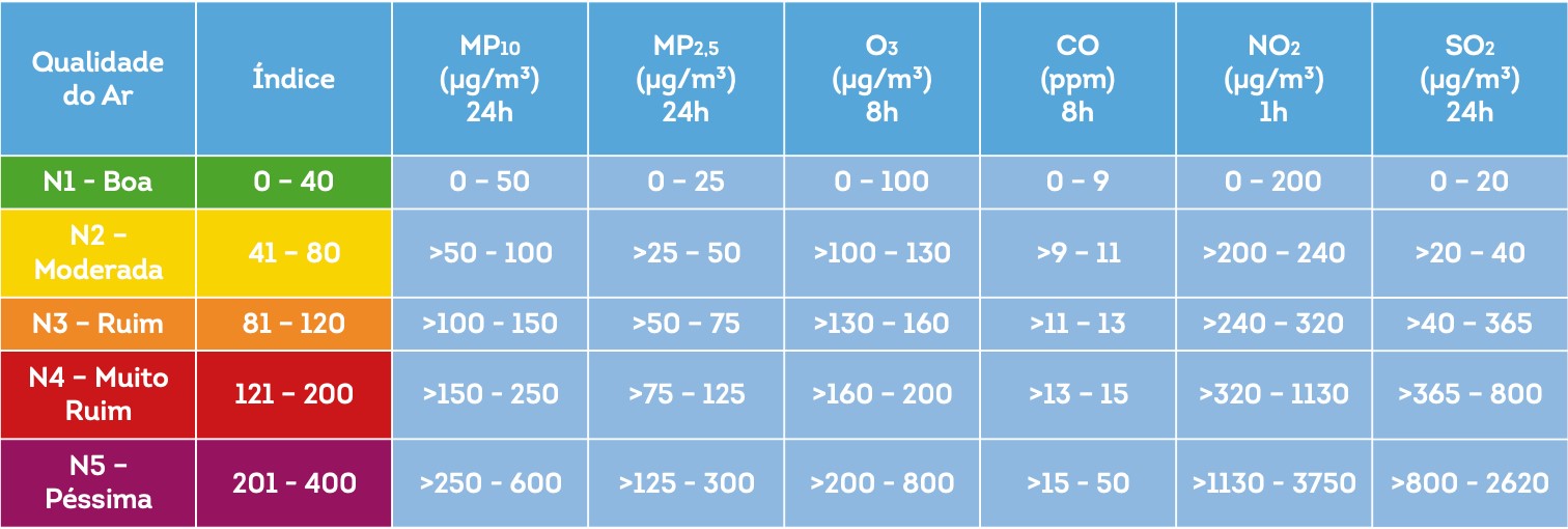 Trata-se de um valor adimensional, calculado para cada poluente medido, e que resulta numa nota para a qualidade do ar, além de uma cor associada a cada valor, conforme quadro abaixo: